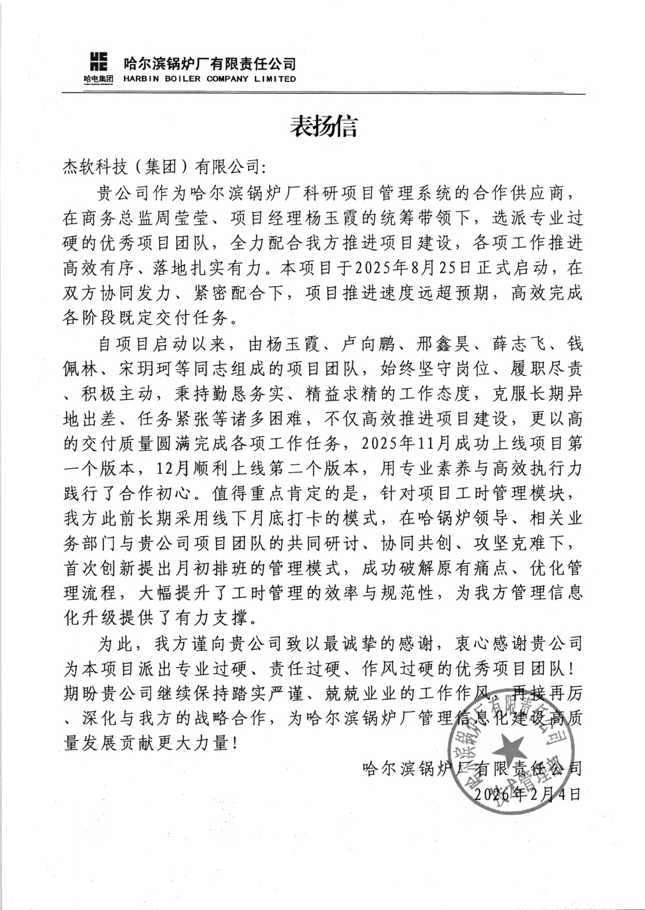 在制造业数字化转型进程中,哈尔滨锅炉厂有限责任公司(简称"哈锅")与杰软科技(集团)有限公司达成战略合作,成功上线新一代科研项目管理系统,推动研发管理向智能化、精益化全面升级。近日,哈锅对在系统建设中贡献突出的项目团队予以通报表彰。
