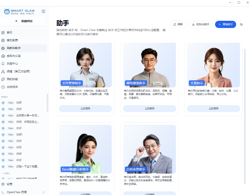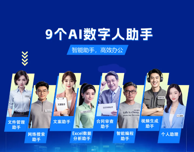 第一,9大专业AI助手。Main通用数字人助手、文件管理助手、网络搜索助手、文案助手、Excel数据分析助手、合同审查助手、智能编程助手、视频生成助手、个人办公助手——九位AI同事各司其职,协同作战,高效终结任务混乱。